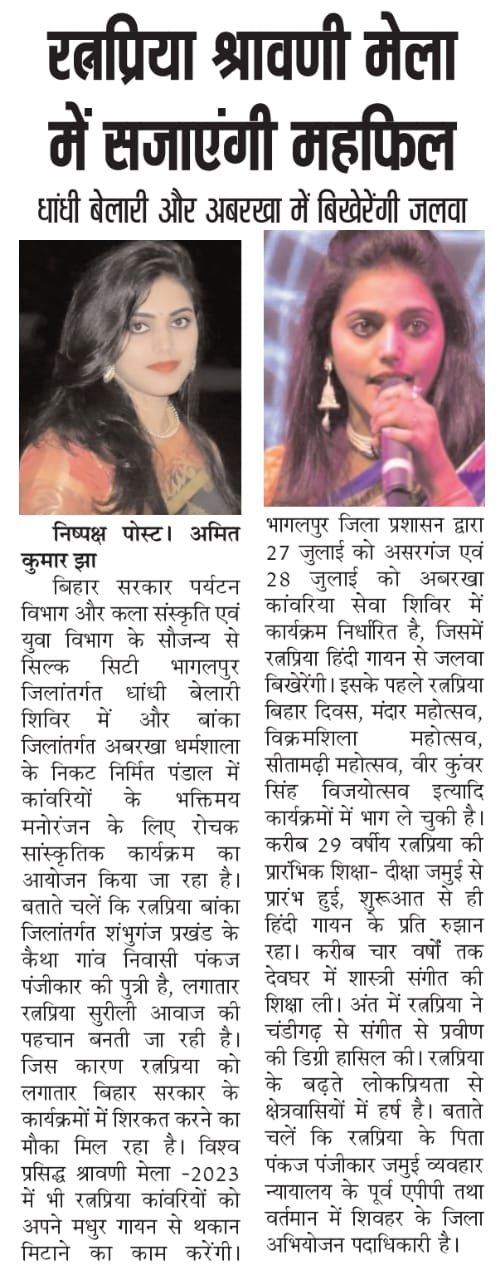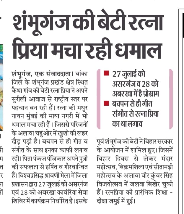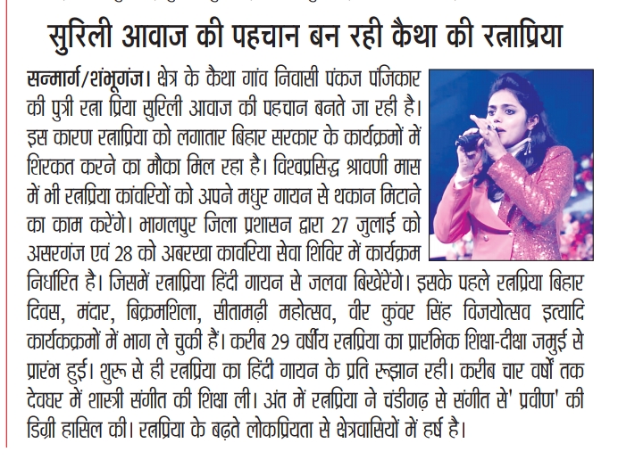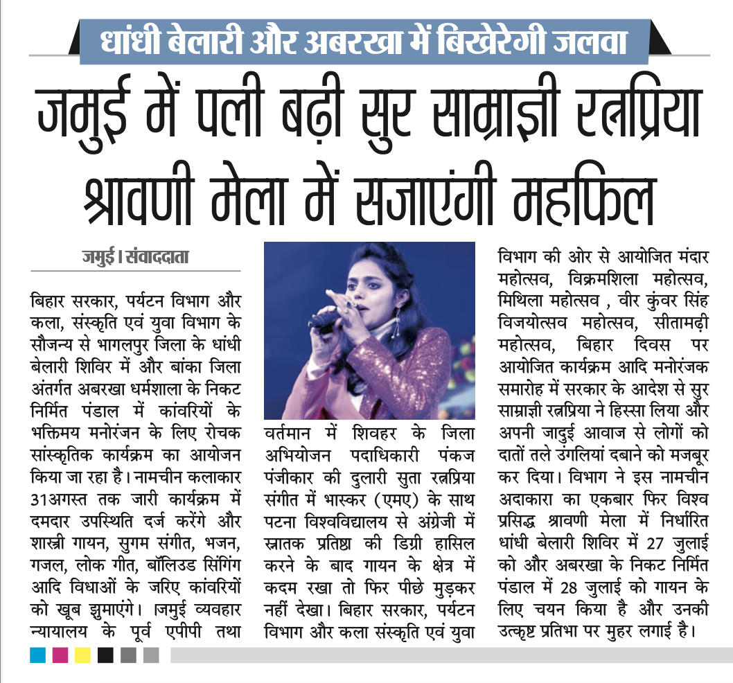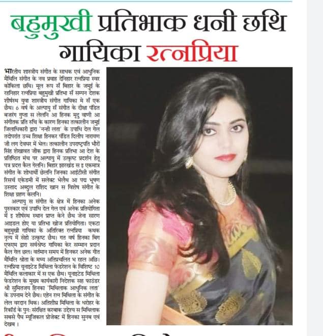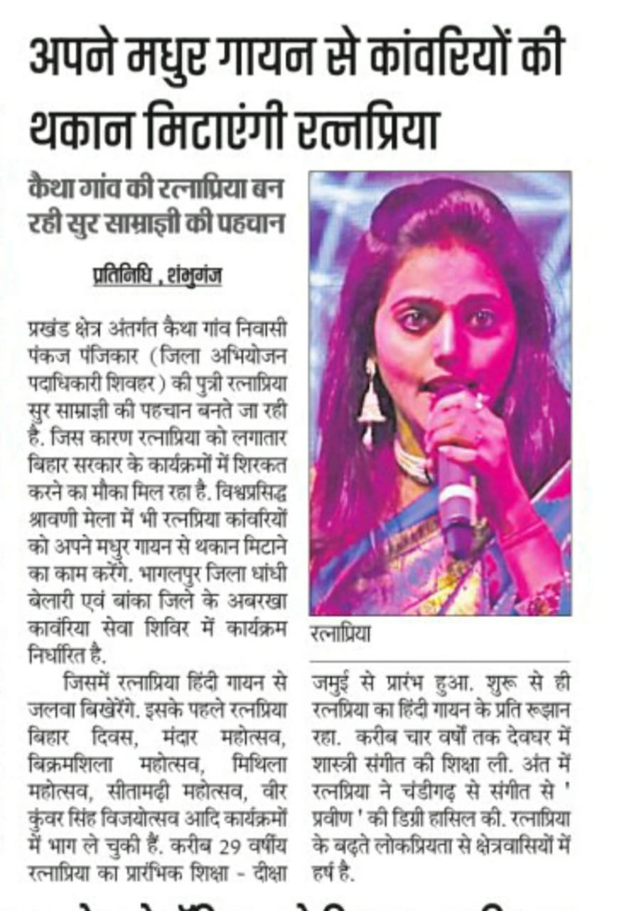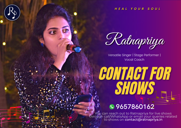 Ratnapriya is a talented Indian singer known for her captivating live-stage performances. With a versatile voice, she mesmerizes audiences with her soulful renditions in multiple Indian languages. Her passion for music and remarkable talent make her a rising star in the Indian music industry.